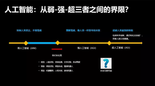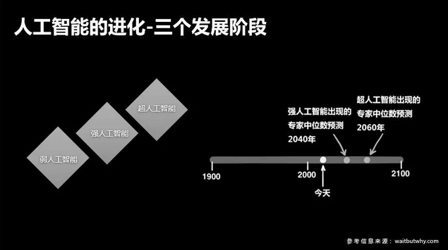 尽管如今的人工智能还处在弱人工智能阶段,但每一个弱人工智能的创新,都在给通往强人工智能和超人工智能的旅途添砖加瓦。专家预测,到了2040年,人们便会看到强人工智能的出现,而超人工智能也会在不远2060年以不可预计的惊人速度来临!